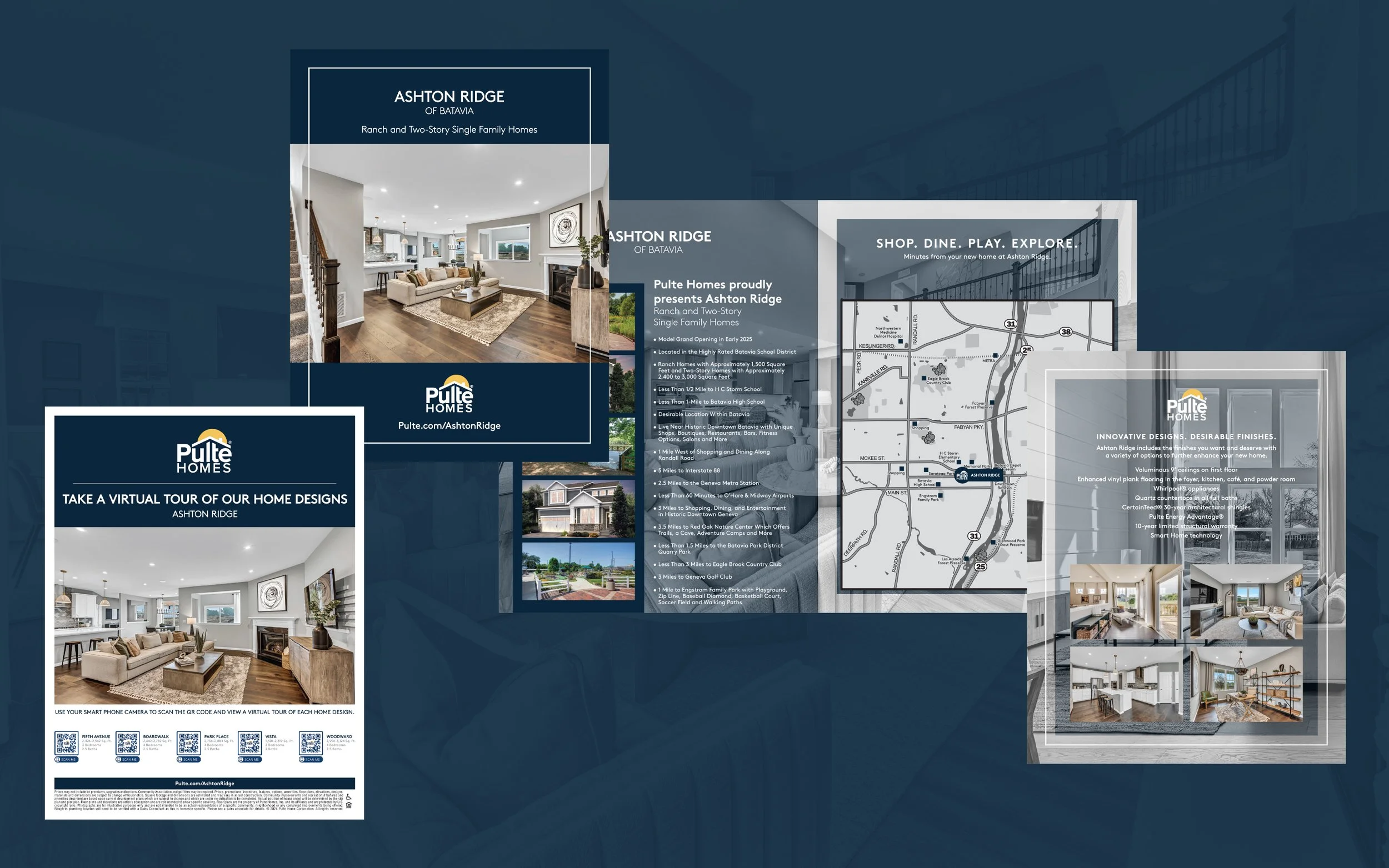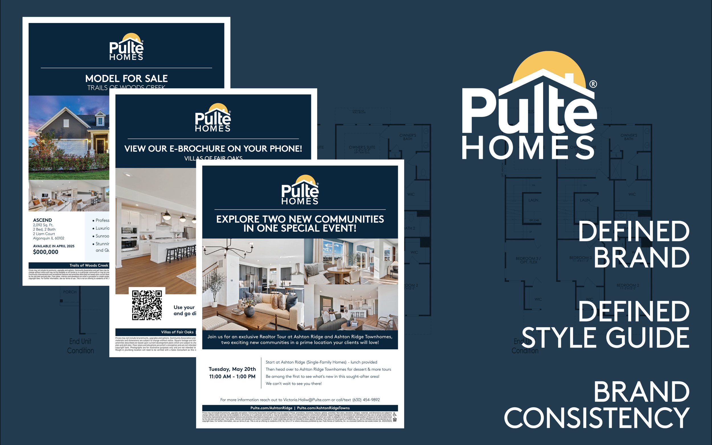 We’ve been working with Pulte Homes for almost 15 years. Those years have seen a rebrand, new identity, and an overall effort to create consistency for the brand across all platforms. Defined fonts, color palette and graphic applications have created a unified look across each piece of marketing collateral.